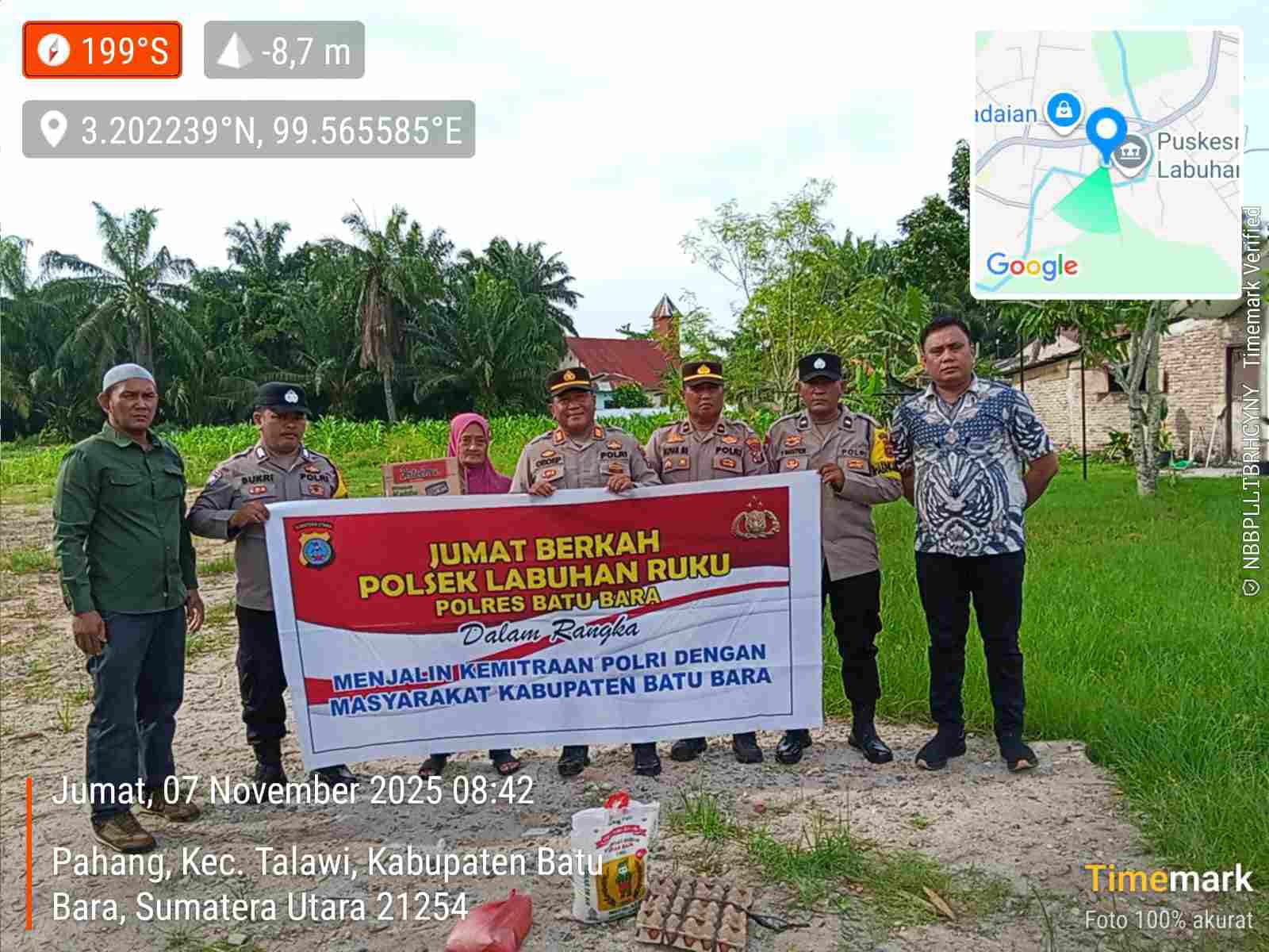 Labuhan Ruku, Batu Bara – Kapolsek Labuhan Ruku, AKP Cecep Suhendra, bersama personel Polsek Labuhan Ruku melaksanakan kegiatan “Jumat Berkah” dengan memberikan bantuan sosial (bansos) berupa sembako kepada kaum dhuafa di wilayah hukum Polsek Labuhan Ruku. Kegiatan ini dilaksanakan pada Jumat, 7 November 2025, sekitar pukul 08.41 WIB.