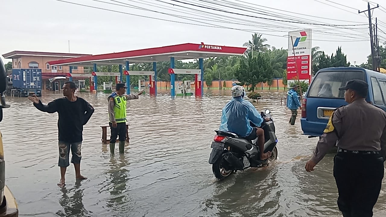 Kapolsek Indrapura bersama Personil Polsek Indrapura melaksanakan patroli dan pengecekan lokasi banjir yang terdampak dari curah hujan Ekstrem di depan SPBU Jalinsum Desa Tanjung Seri Kec. Laut Tador Kab. Batu Bara.