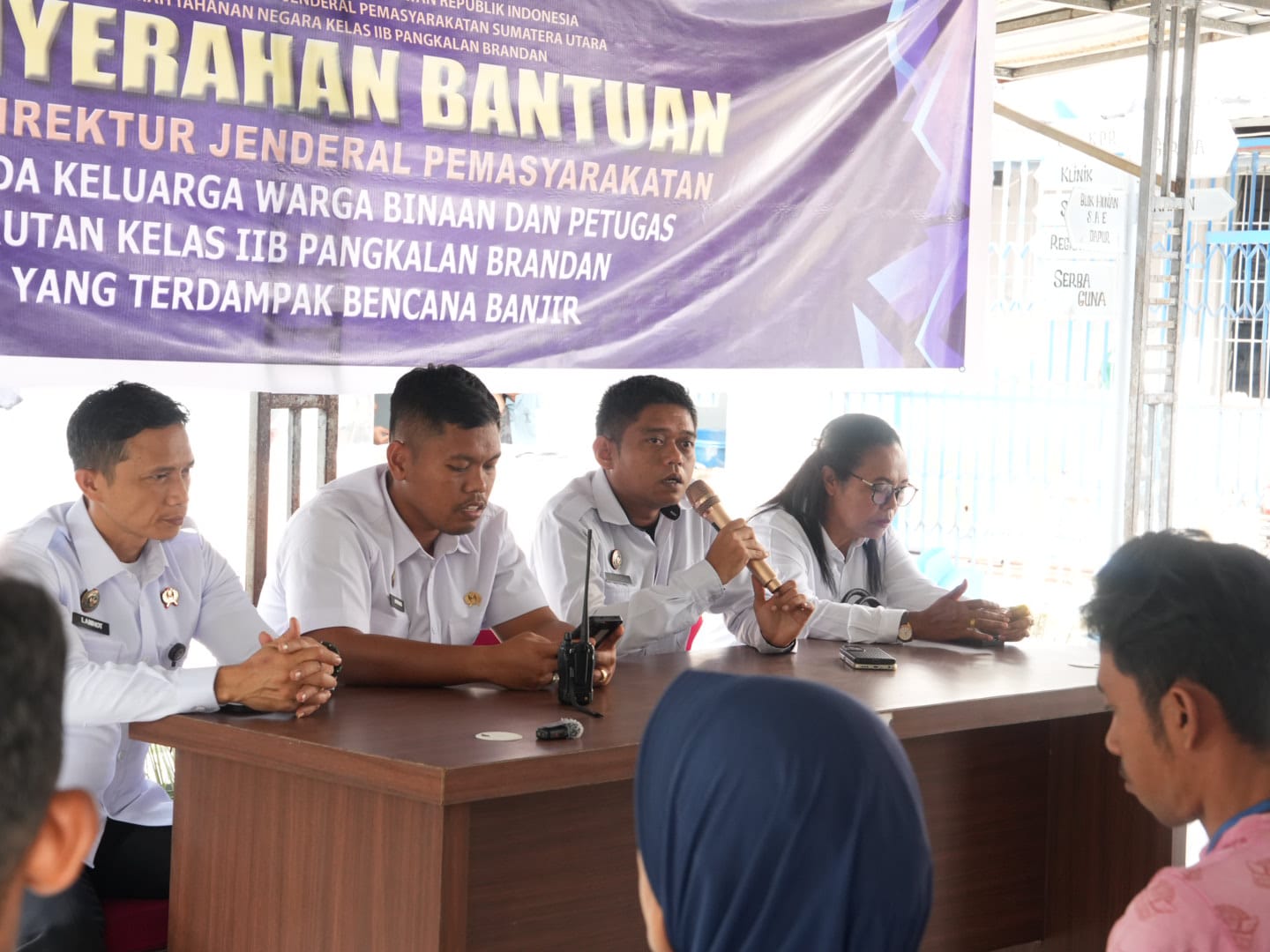PANGKALAN BRANDAN — Rumah Tahanan Negara Kelas IIB Pangkalan Brandan bergerak cepat memulihkan layanan dan menyalurkan bantuan bagi keluarga warga binaan serta petugas yang terdampak banjir. Penyaluran bantuan yang merupakan kiriman dari Direktorat Jenderal Pemasyarakatan itu berlangsung pada Rabu, 10 Desember 2025, dipimpin langsung oleh Karutan Pangkalan Brandan, Akmalun Ikhsan, beserta jajaran struktural.