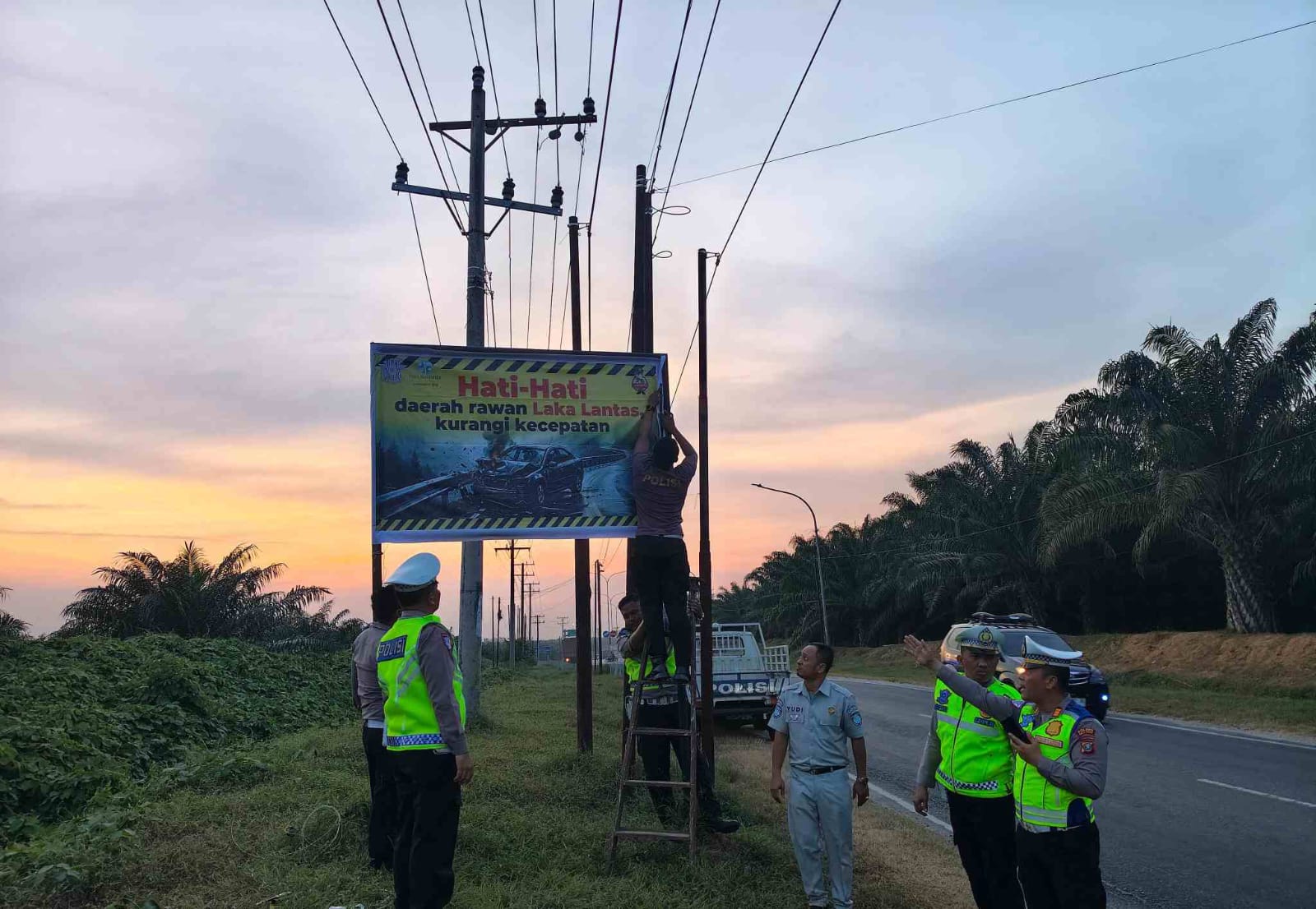 Lima Puluh, Batu Bara – Guna menekan angka kecelakaan lalu lintas (laka lantas), Satuan Lalu Lintas (Satlantas) Polres Batu Bara memasang spanduk himbauan di sepanjang Jalan Umum Lima Puluh – Perdagangan, tepatnya di Desa Mangkai, Kecamatan Lima Puluh, Kabupaten Batu Bara, Jumat (23 Januari 2026).
